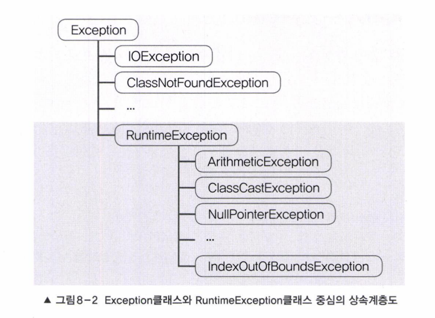 Exception클래스들은 주로 외부의 영향으로 발생할 수 있는 것들로서, 프로그램의 사용자들의 동작에 의해서 발생하는 경우가 많다. 예를 들면, 존재하지 않는 파일의 이름을 입력했다던가, 실수로 클래스의 이름을 잘못 적었다던가, 또는 입력한 데이터 형식의 잘못된 경우에 발생한다.