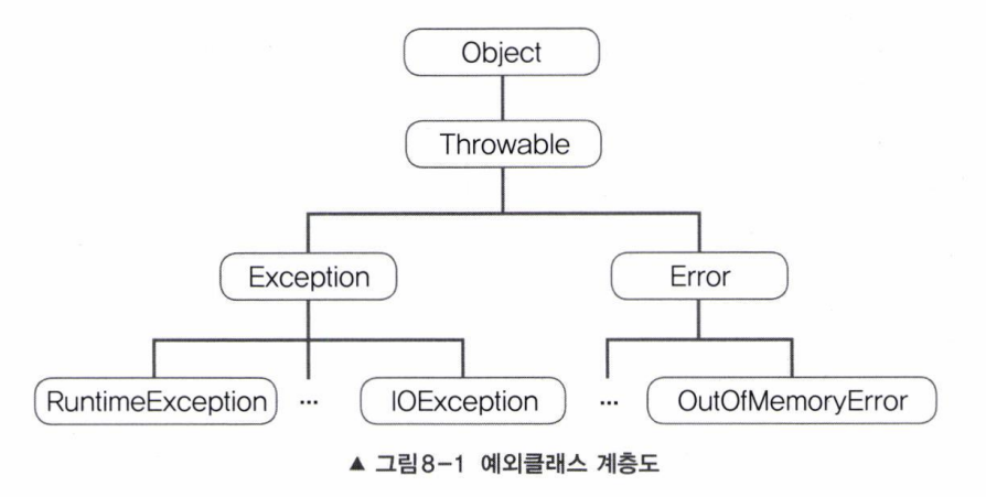자바에서는 실행 시 발생할 수 있는 오류(Exception과 Error)를 클래스로 정의하였다. 앞서 배운 것처럼 모든 클래스의 조상은 Object클래스이므로 Exception과 Error클래스 역시 Object클래스의 자손들이다.