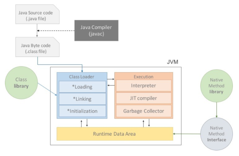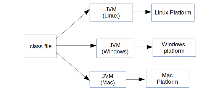 자바 컴파일러는 자바 소스 프로그램을 컴파일하여 바이트 코드로 된 클래스 파일을 생성한다. 이 클래스 파일은 컴퓨터의 CPU에 의해 직접 실행되지 않고, JVM이 인터프리터 방식으로 실행시킨다. 이 클래스 파일은 어떤 OS를 탑재하든 CPU의 종류가 무엇이든, 어떤 하드웨어든 상관없이 JVM만 있으면 바로 실행 가능하며, 실행시 JVM의 JIT컴파일러에 의해 바이너리 코드로 변환되어 프로그램을 실행시킨다.