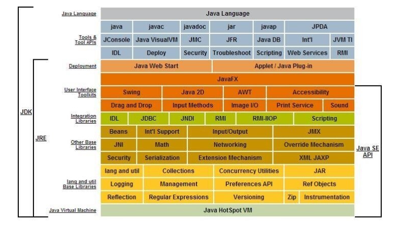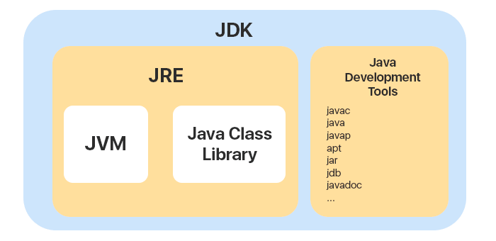 JDK에는 JAVA 프로그램을 작성하는데 필요한 도구와 이를 실행하는데 필요한 JRE가 포함되어 있으며, 컴파일러(javac), JAVA 애플리케이션 시작 프로그램, 애플릿 뷰어 등도 포함되어 있다.