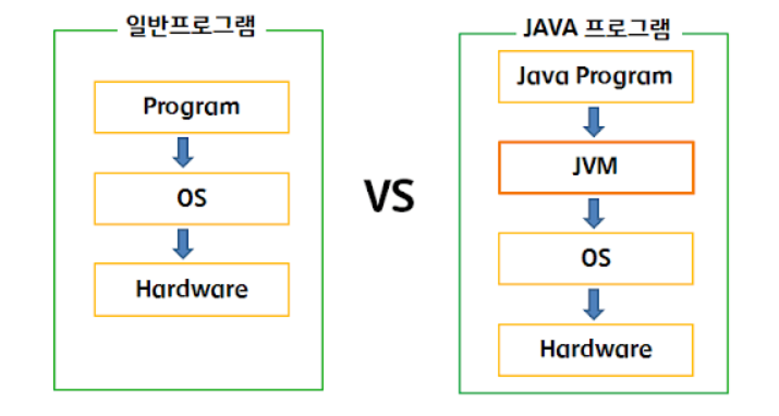 위 이미지를 보면 일반 프로그램은 OS와 바로 맞붙어 있기 때문에 OS종속적이다. 때문에 다른 OS에서 실행시키기 위해서는 애플리케이션을 그 OS에 맞게 변경해주어야한다. 반면 자바 프로그램은 JVM하고만 상호작용을 하기 때문에 OS와 하드웨어에 독립적이라 다른 OS에서도 프로그램 변경없이 실행이 가능한 것이다. 단, JVM은 OS에 종속적이여서 해당 OS에서 실행가능한 JVM이 필요하다.