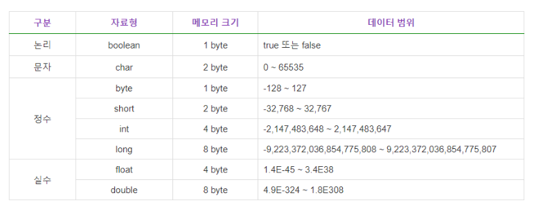 기본형 데이터타입에서 boolean을 제외한 나머지 기본형 데이터들은 서로 연산과 변환이 가능하다. 그리고 정수타입중 가장 많이 쓰는 자료형은 위와 같이 int라고 언급하였는데, 이유는 CPU가 가장 효율적으로 처리할 수 있는 타입이기 때문이다. 만약 효율적인 실행보다 메모리를 절약하고자 한다면 byte 또는 short를 사용하길 바란다.
