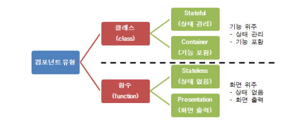 리액트는 컴포넌트 기반의 라이브러리이다. UI를 하나의 큰 덩어리로 생각하면 컴포넌트는 그 덩어리를 이루는 작은 요소들이다. 그런 요소들을 설계해서 쌓아 올리면 하나의 UI가 만들어지며 컴포넌트들은 쪼개져있기 때문에 전체 코드를 파악하기가 상대적으로 쉽다. 또한 컴포넌트들은 다른 화면에서도 사용될 수 있는 재사용성을 가지고 있기 때문에 같은 코드를 반복적으로 입력할 필요가 없어 효율적이다. 컴포넌트의 종류는 클래스형과 함수형으로 나뉜다.