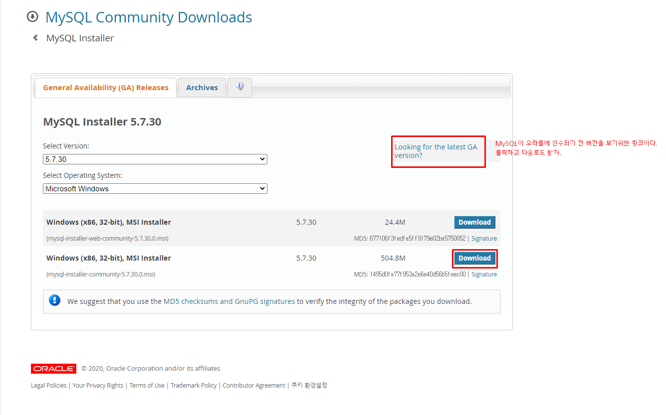 3. 필자는 오라클사가 인수하기 전의 가장 최신 버전인 MySQL을 다운로드 받기위해 아래 처럼 진행하였다.