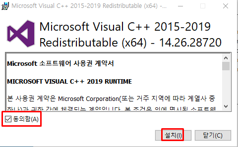 7. 위 과정 진행중 다음과 같은 화면이 뜨면 '동의함' 체크후 '설치' 클릭