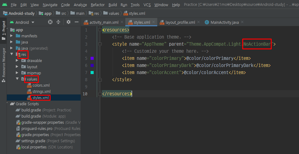 기존의 'DarkActionBar'를 'NoActionBar'로 바꿔주면 해결!