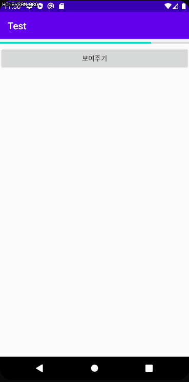 타이틀 부분에 막대 ProgressBar가 존재하며 '보여주기'를 클릭하면 원 모양 ProgressBar가 보여진다. 화면 아무곳이나 클릭하면 원 모양 ProgressBar가 사라진다.