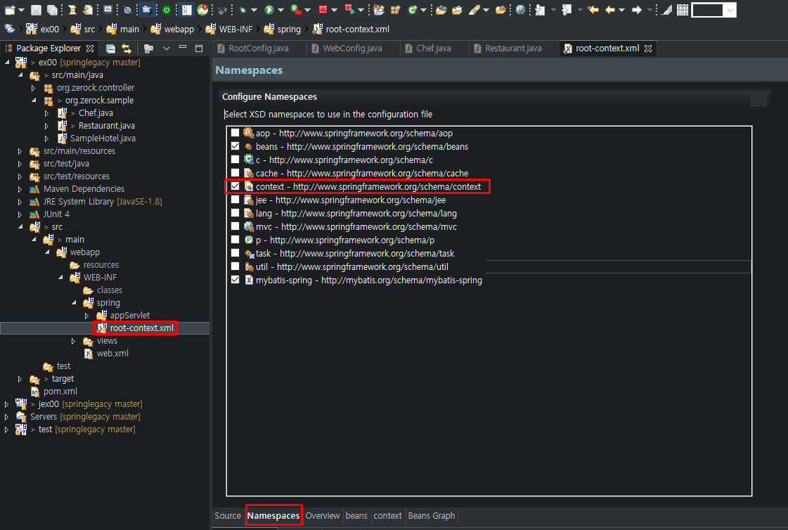 1. 'root-context.xml' 파일로 이동하여 아래쪽에 위치하는 'NameSpaces' 탭을 클릭하고 'context' 항목 체크
