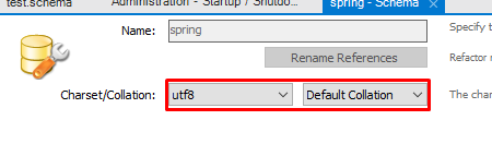 4. 위와 같이 쿼리를 작성하고 실행해보면 다음과 같은 화면이 출력되며, 빨간박스인 database가 latin1로 나온다면 DB에 마우스 우클릭하고 'Alter Schema...' 클릭