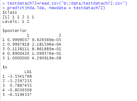 위 명령어는 유보표본 데이터를 불러와서 판별분석을 실시한 Mda.lda에 새로운 데이터를 적용하여 집단을 판별하라는 것이다.