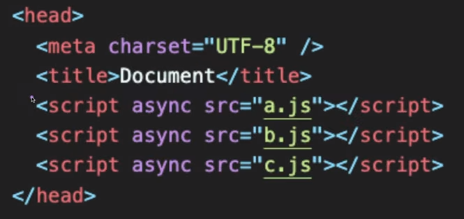 스크립트를 작성하는 또다른 방법은 헤드내부에 스크립트를 작성 시 async를 걸어주는 것이다. async를 걸면 브라우저는 HTML파일을 파싱하다가 스크립트 태그를 만나면 비동기적으로 서버로부터 .js파일을 다운받으며 다운이 완료되면 파싱을 멈추고 .js를 실행한다. 만약 위 자료처럼 스크립트파일을 여러개 읽는다면 서버로부터 다운받는 시점은 비슷하게 비동기적으로 이루어지며 작성 순서와 상관없이 다운로드가 완료된 .js파일을 먼저 실행하는데, 각각의 .js파일이 실행될때는 파싱을 멈추고 실행된다. 이로인해 야기되는 문제점은 헤드태그에 노멀한 스크립트태그를 작성하였을때 야기되는 문제점은 동일하게 발생되며, 추가적으로 스크립트 파일이 여러개일때 스크립트 태그 순서가 웹페이지에 영향을 미치는 구조라면 async를 사용하는 것은 매우 위험한 일이 될 수 있다.