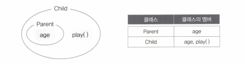 자손 클래스는 조상 클래스의 모든 멤버를 상속받는다. 클래스는 멤버의 집합이므로 조상 클래스와 자손 클래스를 다음과 같이 표현할 수 있다.