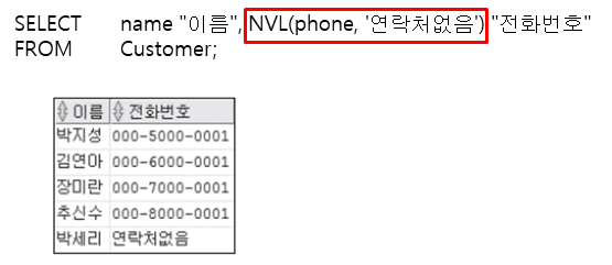 - NVL(속성,값) : 속성값이 NULL이면 '값'으로 대치한다.