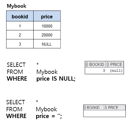- NULL값을 찾을 때는 '=' 연산자가 아닌 'IS NULL'을 사용