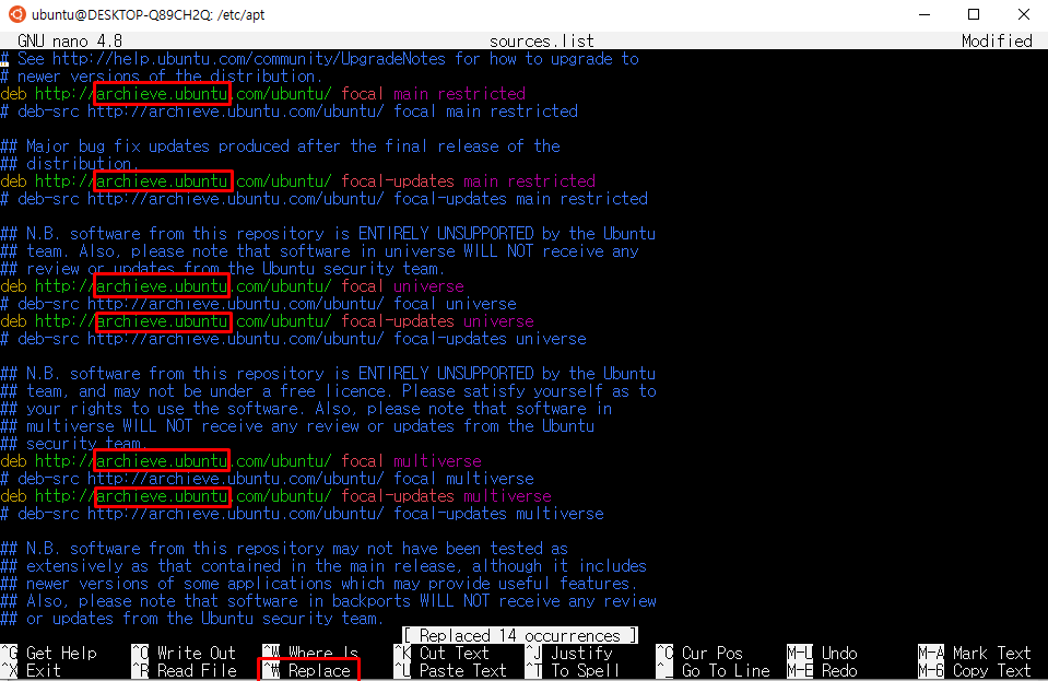 5. replace를 통해 archieve.ubuntu를 바꾸고 싶은 저장소의 주소로 바꾸어주고 저장후 Exit
