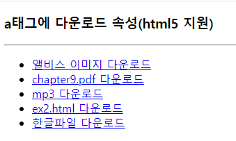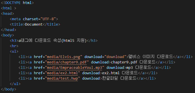 <a>태그의 download속성은 이미지, PDF, MP3, HTML파일, HWP파일, PPT파일 등 모든 파일을 다운로드 할 수 있는 링크를 만든다. 이때 다운로드 할 파일명은 href속성에 지정한다.