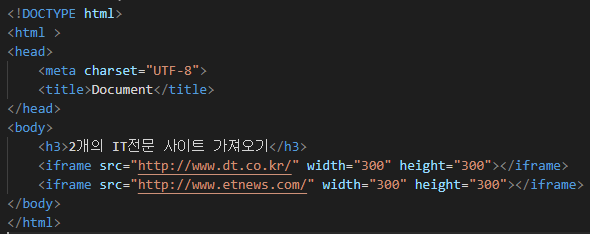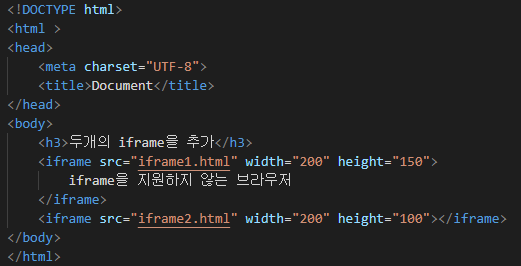 위와같은 코딩으로 두개의 iframe을 다른 HTML페이지에 출력할수 있는데, 이때 2개의 iframe.html 문서가 있어야하며 없을경우 </iframe>앞에 텍스트가 대신 출력된다.