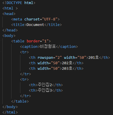 위 이미지는 <th>태그에 rowspan속성을 주어 열을 합친것이다. colspan은 행을 합치는 속성이다.