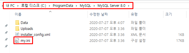 1. 우선 'my.ini' 파일을 찾아서 관리자권한으로 연다.