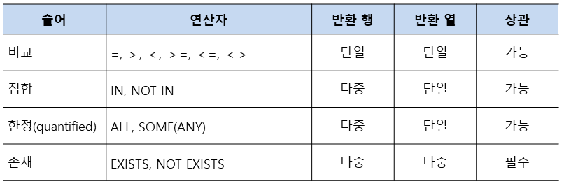 - 중첩질의 연산자의 종류
