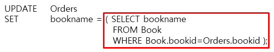 - 스칼라 부속질의는 원칙적으로 스칼라 값이 들어갈 수 있는 모든 곳에 사용 가능하며, 일반적으로 SELECT문과 UPDATE SET절에 사용된다.