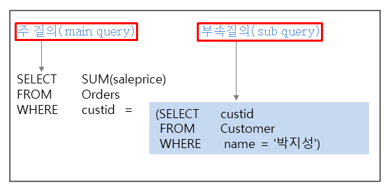 - 주질의(main query, 외부질의)와 부속질의(sub query, 내부질의)로 구성된다.